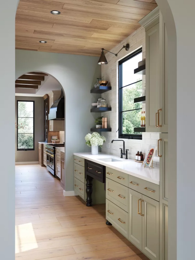 the kitchen island, even for those who aren’t as adventurous with their design choices. According to Pierce, extending that splash of color to the perimeter of the kitchen is quickly becoming the norm. She also confirmed what we’ve been seeing trending—blues and greens are the most popular shades outside of shades of white.